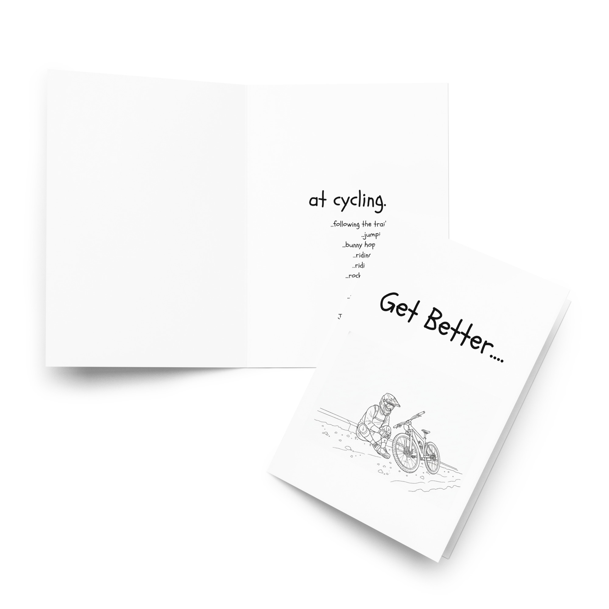 Riding a mountain bike is synonmous with getting dirty, getting injured and having fun. Cyclists sense of humor can be ornery. This card is made by cyclists for cyclists. Tell your friend you care and tell them to stop crashing. The message of the card is “Get better at cycling… following the trail, jumping, bunny hopping, riding mud, riding sand, rock gardens, chutes, washing out… just, get better.”